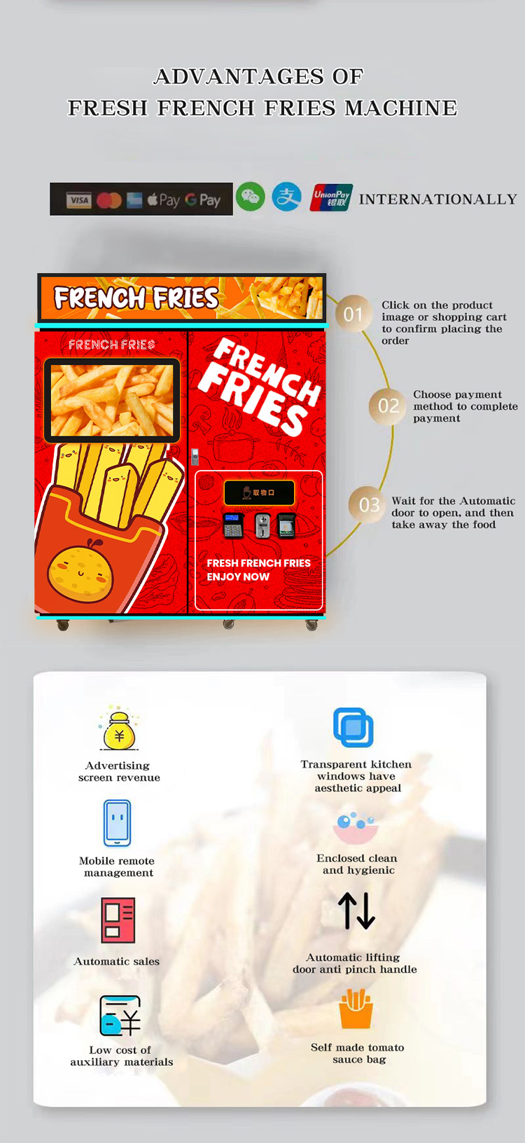 The intuitive touchscreen interface makes ordering a breeze. Choose your portion, and with a simple tap of your credit card, mobile payment, or digital wallet, your fries are on the way. A completely hygienic and seamless experience.